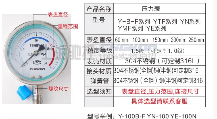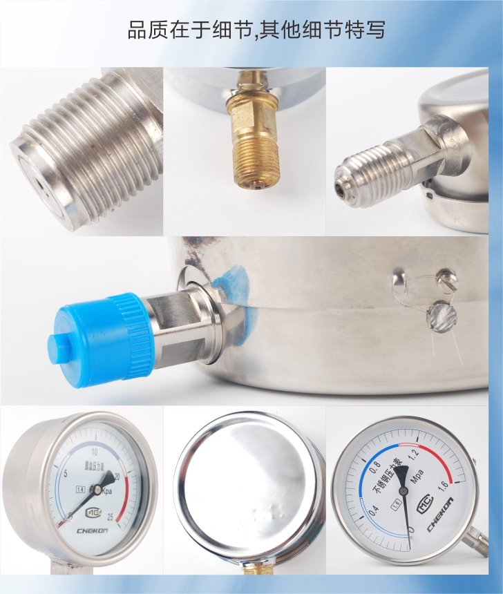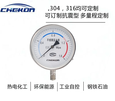 不銹鋼壓力表采用直接接觸式接頭和感壓元件材料,采用icr18Ni9T、Ocr18Ni12Mo2Ti、 sus316,結(jié)構(gòu)為全密封型,具有較強的防被測介質(zhì)腐蝕和抗環(huán)境腐蝕的能力。不銹鋼壓力表適用于腐蝕性較強的適合不銹鋼元件檢測的介質(zhì)和惡劣的外部腐蝕環(huán)境中 ,不銹鋼壓力表廣泛應(yīng)用于石油、化工、冶金等工業(yè)。