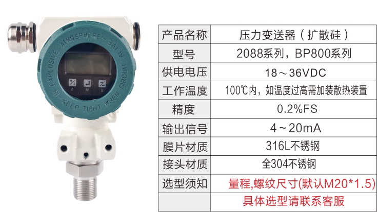 BP800系列變送器主要由測壓元件傳感器(也稱作壓力傳感器)、測量電路和過程連接件三部分組成。它能將測壓元件傳感器感受到的 氣體、液體等物理壓力參數(shù)轉(zhuǎn)變成標(biāo)準(zhǔn)的電信號(hào)(如4~20mADC等),以供給指示報(bào)警儀、記錄儀、調(diào)節(jié)器等二次儀表進(jìn)行測量、指示和過程調(diào)節(jié)。