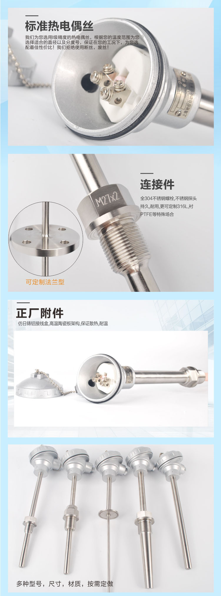 鎧裝熱電偶作為溫度測(cè)量傳感器,這與溫度變送器、調(diào)節(jié)器及顯示儀表等配套使用,組成過(guò)程控制系統(tǒng),用以直接測(cè)量或控制各種生產(chǎn)過(guò)程中0-1800℃范圍內(nèi)的流體、蒸汽和氣體介質(zhì)以及固體表面等溫度。鎧狀熱電偶具有能彎曲、耐高壓、熱響應(yīng)時(shí)間快和堅(jiān)固耐用等許多優(yōu)點(diǎn),它和工業(yè)用裝配式熱電偶一樣,作為測(cè)量溫度的傳感器,通常和顯示儀表、記錄儀表和電子調(diào)節(jié)器配套使用